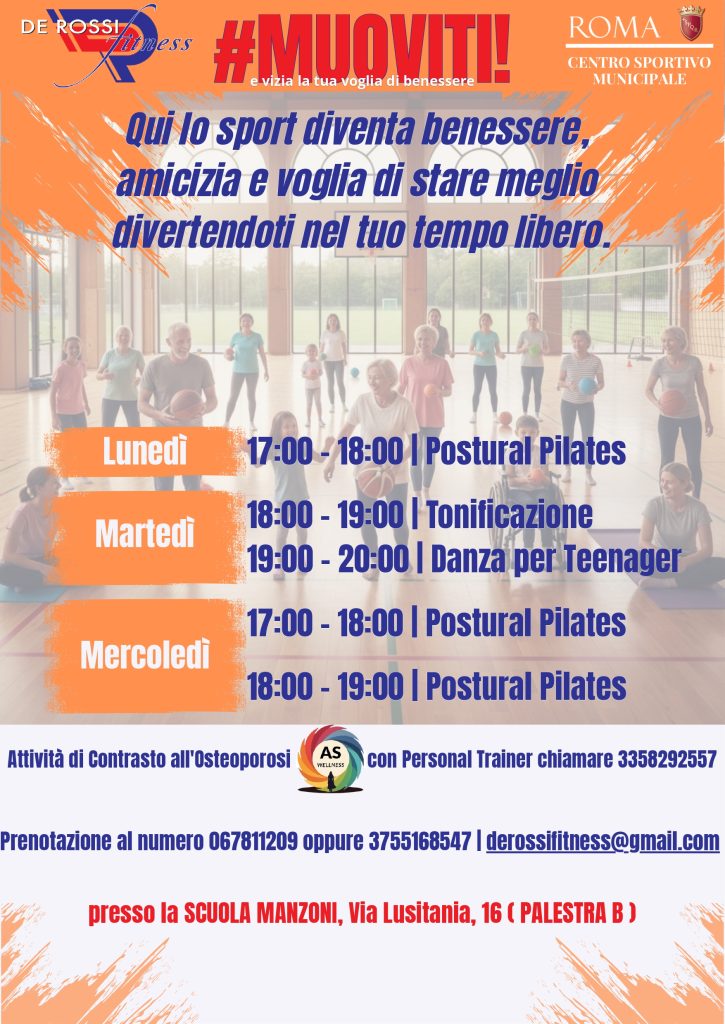 È finalmente disponibile il calendario aggiornato delle attività presso la Palestra B della Scuola Manzoni (Via Lusitania, 16). Che tu voglia migliorare la tua postura, scatenarti con la danza o ritrovare l’equilibrio tra corpo e mente, abbiamo il corso perfetto per te! 🚀 🕒 Il Nostro Programma Settimanale Organizza la tua settimana all’insegna del movimento. Ecco i nostri appuntamenti: 🔹 Attività Speciali e Percorsi Mirati In collaborazione con AS Wellness, offriamo un programma specifico per il contrasto all’osteoporosi. Se invece cerchi un supporto individuale, è sempre disponibile il nostro servizio con Personal Trainer per un percorso costruito su misura per le tue esigenze. Nota importante: Le lezioni vengono confermate con un minimo di 4 partecipanti 📞 Per info su Osteoporosi e Personal Training: Chiama il 335 8292557 ℹ️ Info Utili e Sedi 📞 Contatti e Prenotazioni I posti sono limitati! Per tutte le attività di gruppo, puoi riservare il tuo posto contattando la segreteria della ASD De Rossi Fitness & Wellness: Vieni a trovarci nella nostra sede principale o raggiungici alla Scuola Manzoni per iniziare il tuo percorso di benessere! ✨